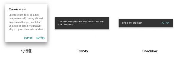 在Material Design規(guī)范里,提示只有對話框(確認(rèn))及Toast(確知)和Snackbar(確知),同理對話框也是一種非常強(qiáng)的提示方式,會直接打斷用戶操作,所以設(shè)計時要謹(jǐn)慎對待。